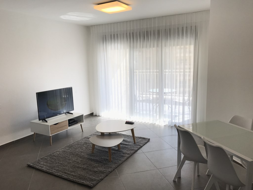 In the beautiful and brand new complex down town. Totally renovated and new apt for rent. Heating and cooling A\C. One bedroom and full shower. In the complex elevator and private parking. Fee- one month plus VAT. 7500 Nis for fully furnished.