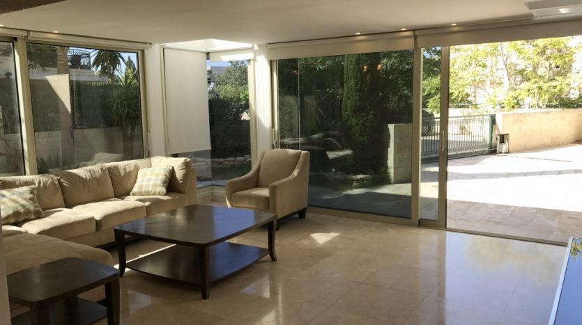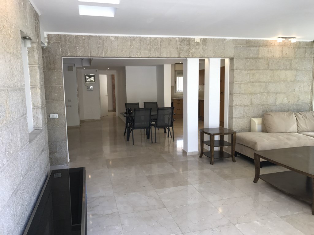 In the beautiful complex Caspi Residence. Four bedrooms apt for rent, two full bathrooms and guest toilet. Renovated, central A\C for cooling and heating and Private heating on gas. Patio facing an amazing green garden. Option for fully or semi furnished. In the building, private parking, storage room and elevators. 5,000 US$. Fee- one month plus VAT.